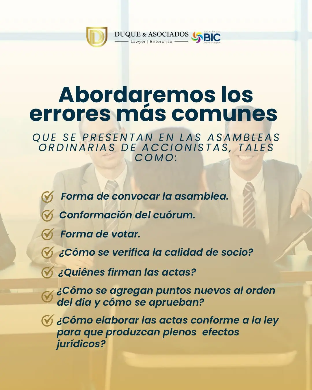 Una oportunidad ideal para empresarios, representantes legales, contadores y miembros de junta que desean realizar sus asambleas correctamente y evitar riesgos legales.